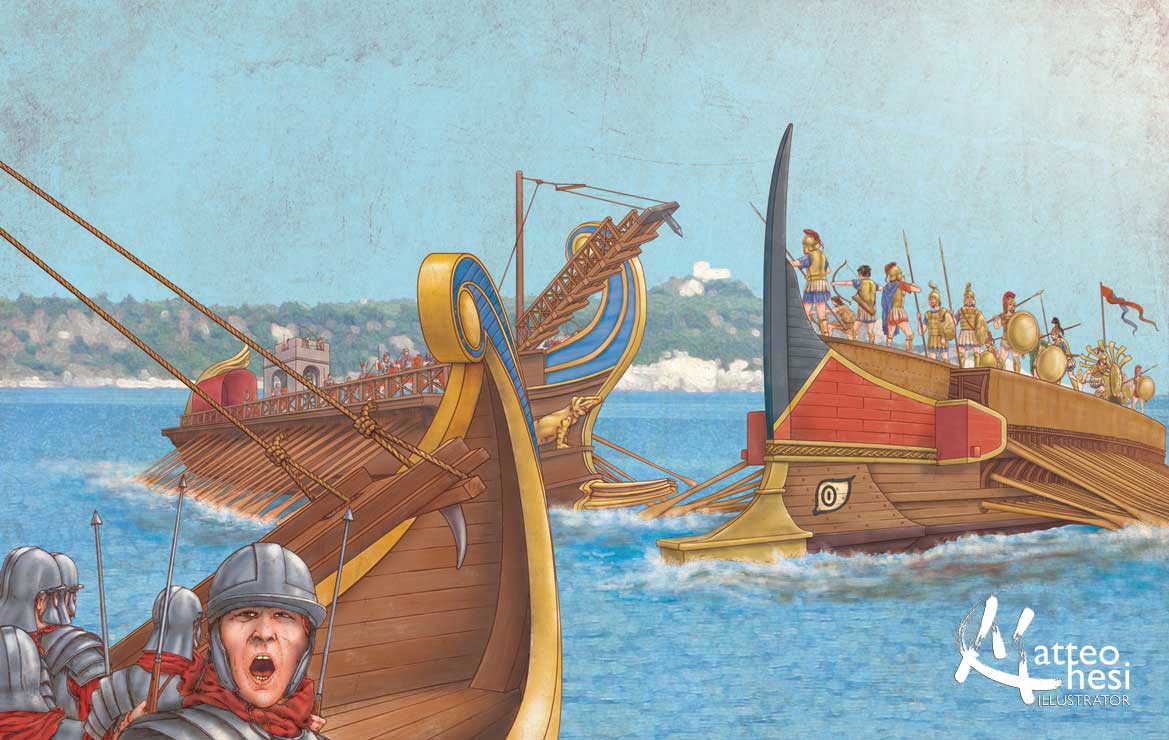 Illustrazione di ricostruzione storica riproducente la battaglia di Milazzo per Palumbo Editore.