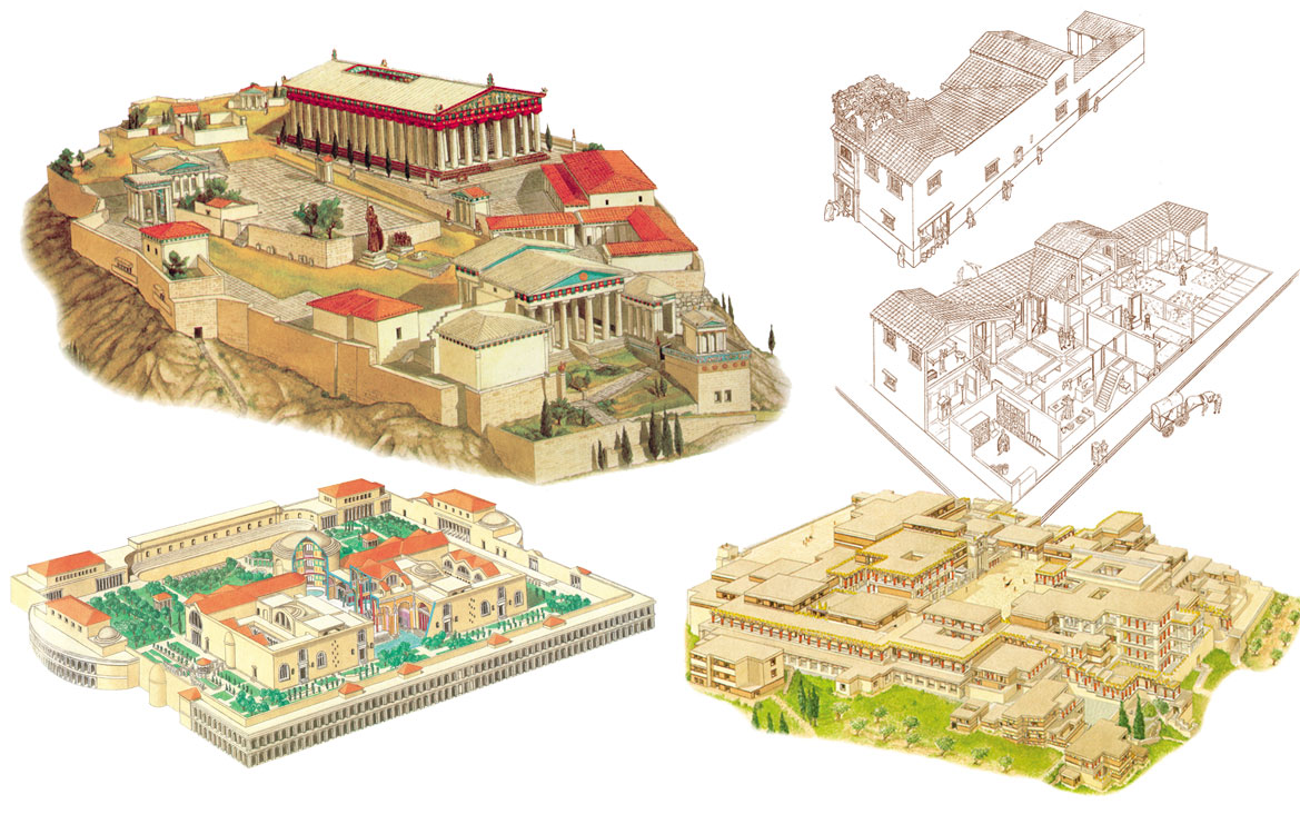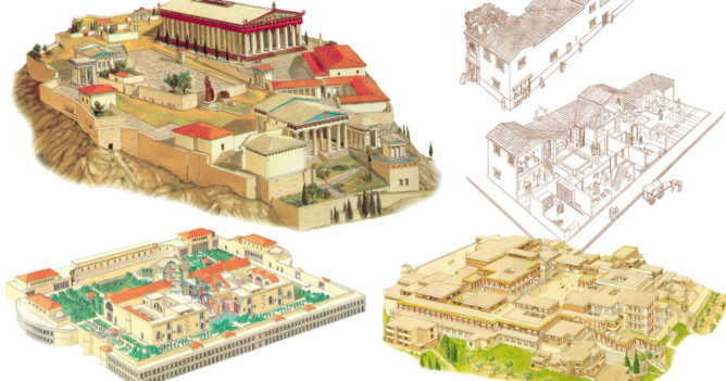 Illustrazioni di ricostruzione architettonica storiche, dell’acropoli di Atene, della città di Cnosso, delle terme di Caracalla, e di una domus Romana.