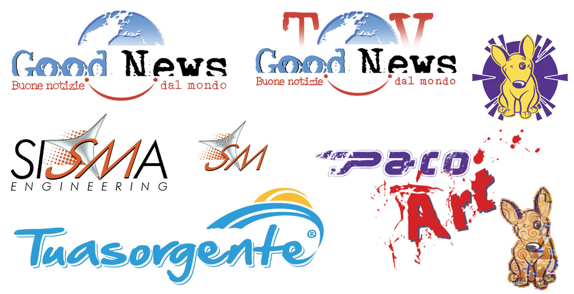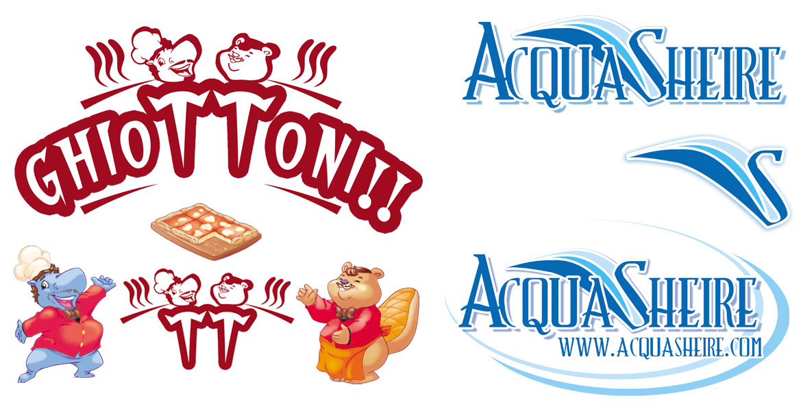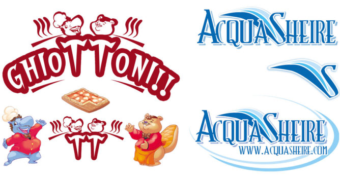 Progettazione Marchio e logotipo per la gastronomia “Ghiottoni!!” e per l’azienda AcquaSheire, installatrice di depuratori per acqua, con tecnologia ad osmosi inversa.
