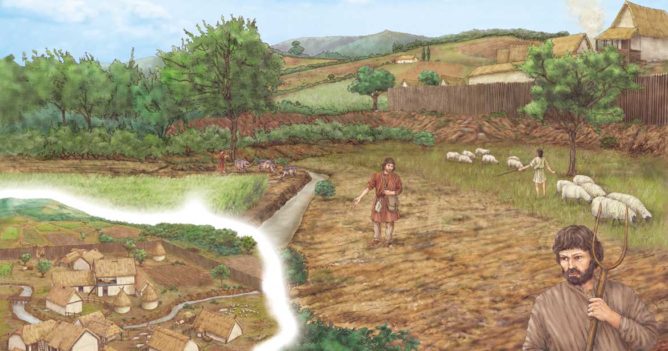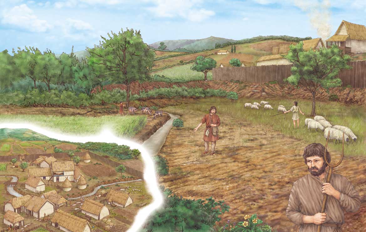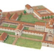 Illustrazione di ricostruzione di una curtis medioevale. Per Palumbo Editore