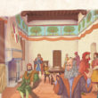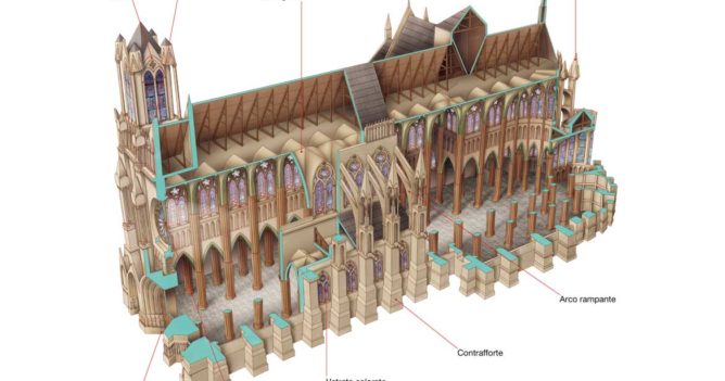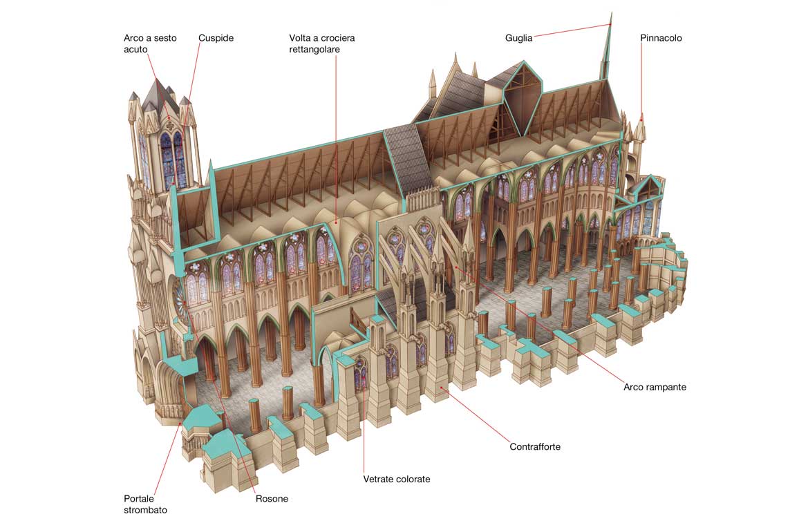 Illustrazione di ricostruzione architettonica di cattedrale gotica, realizzata per Mondadori Education.