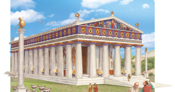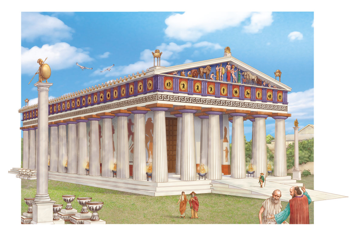 Ricostruzione architettonica del tempio di Zeus ad Olimpia realizzata per Mondadori education.