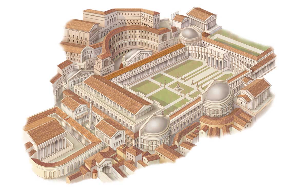 Illustrazione di ricostruzione architettonica dei fori Traiani. Realizzata per Mondadori education.